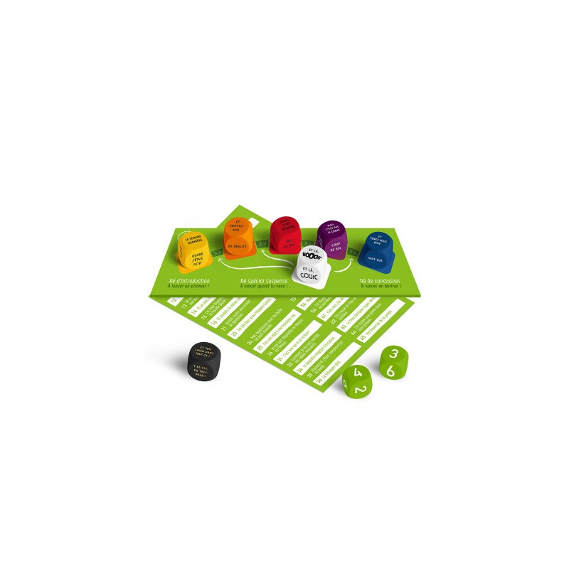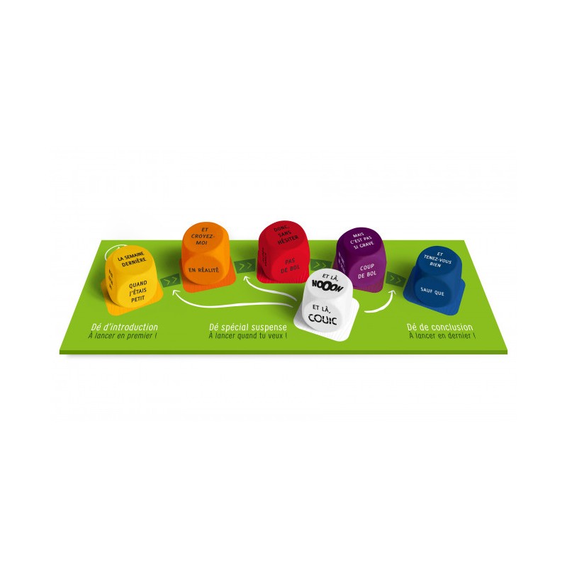 Le narrateur prend le dé blanc et les 5 dés colorés, placés du plus clair au plus foncé. Ils vont l'aider à rythmer son récit avec des mots de transition comme Un beau jour / En plus / Quand soudain / Coup de bol / Et comme par magie . Le narrateur lance le dé jaune, invente la suite de la phrase et poursuit en jetant les dés suivants l'un après l'autre. Seule exception : le dé blanc, qu'il peut lancer quand il veut pour rebondir avec les onomatopées Et là, Paf / Couic / Nooon / Hmmm... / Grrr ou Tin, tin, tiiin !