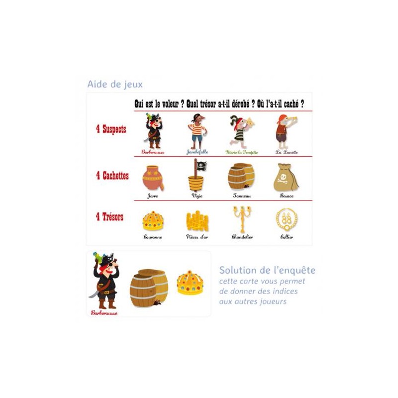 Pour le découvrir, 64 cartes enquête vont vous permettre d’éliminer une à une chaque hypothèse afin de confondre le coupable et de retrouver le trésor volé !