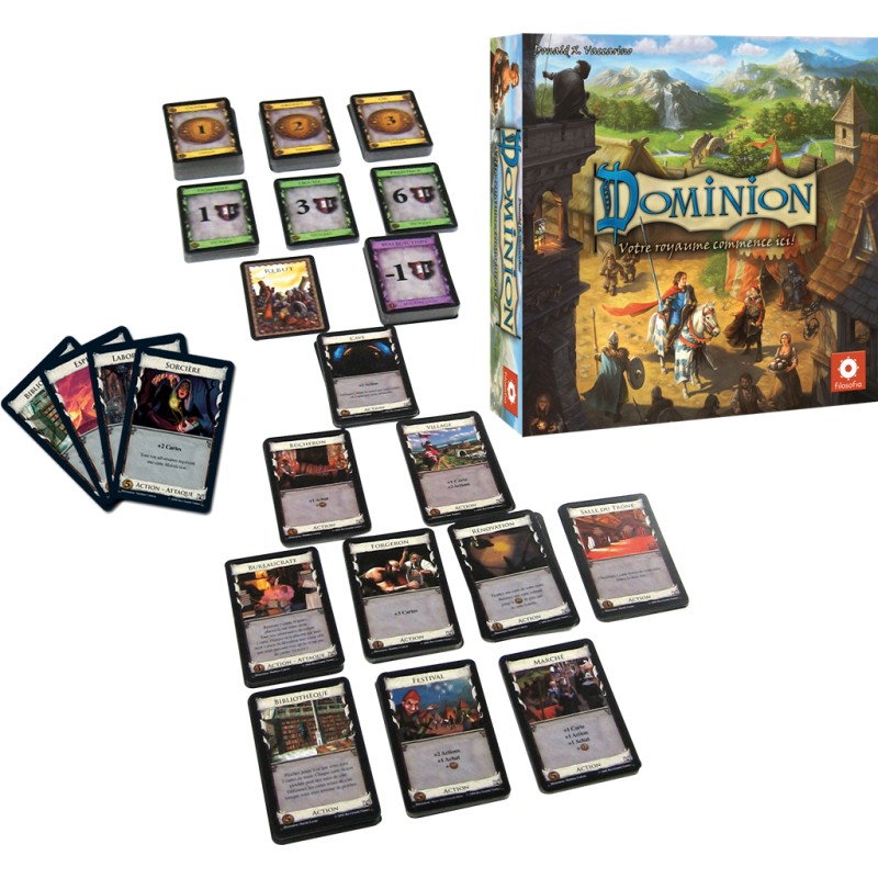 Dans Dominion, chaque joueur commence avec un petit paquet de cartes identique. Au centre de la table se trouve une sélection d'autres cartes que les joueurs peuvent "acheter" au fur et à mesure qu'ils peuvent se le permettre. Grâce à leur sélection de cartes à acheter, et la façon dont ils jouent leurs mains, les joueurs construisent leur paquet à la volée, s'efforçant de trouver le chemin le plus efficace vers les précieux points de victoire à la fin du jeu.
