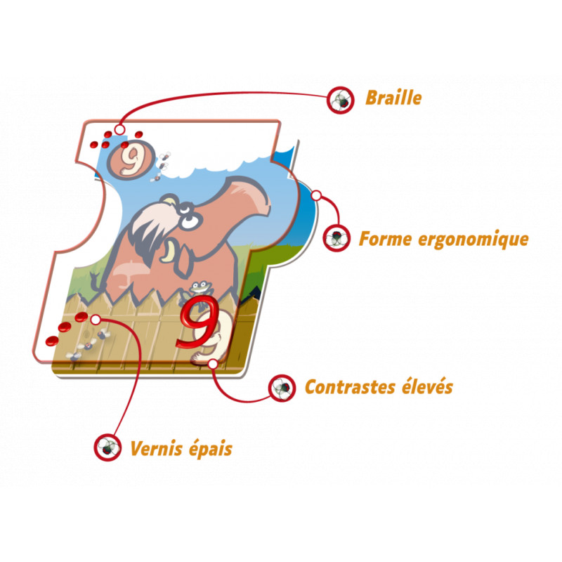 En haut à gauche de la tuile, le chiffre est indiqué en braille, et en bas à gauche, de gros points en relief indiquent le nombre de mouches présentes sur les vaches.