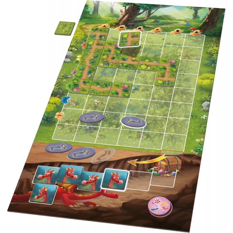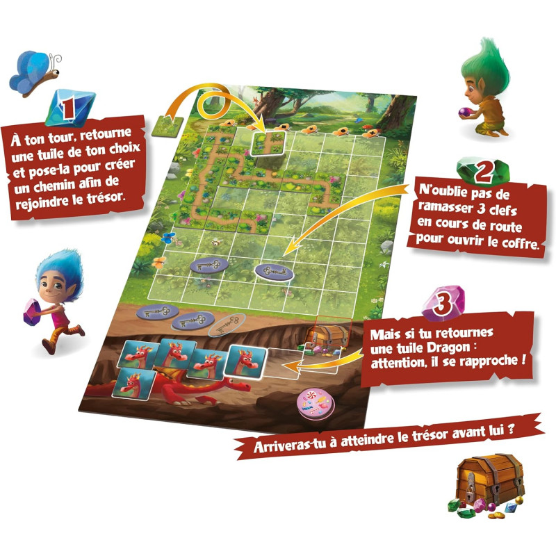 En posant chacun leur tour une tuile sur le plateau, les joueurs doivent faire équipe pour se frayer un chemin au milieu de la forêt et récolter les trois clés qui permettent d'ouvrir le coffre. Mais il ne faut pas trop tarder car le dragon est sur le chemin du retour et il risque fort de surprendre les lutins... et de garder son précieux butin !