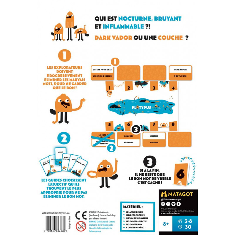 Acide ? Dangereuse ? Énervante ? Une vendeuse de voitures ! Comestible ? Rapide ? Souple ? Captain America ou une autruche ? Dans Platypus, les joueurs coopèrent pour éliminer progressivement les mauvais mots, afin de trouver et d'identifier le Platypus grâce à leurs cartes Adjectif. Entre définitions très personnelles et cartes en main limitées, il faudra parfois avoir de l’intuition et même de l’imagination !