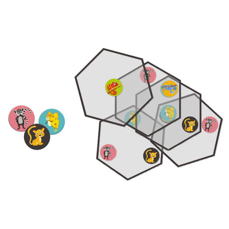 Superpose les cartes transparentes et essaie de créer un alignement de trois animaux similaires pour pouvoir récupérer un jeton !