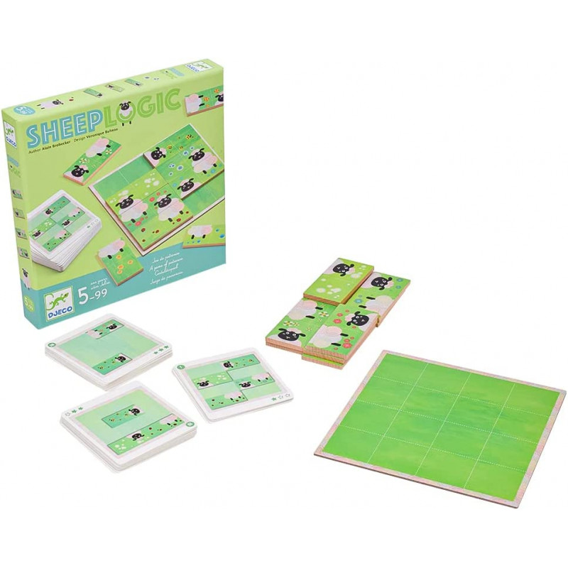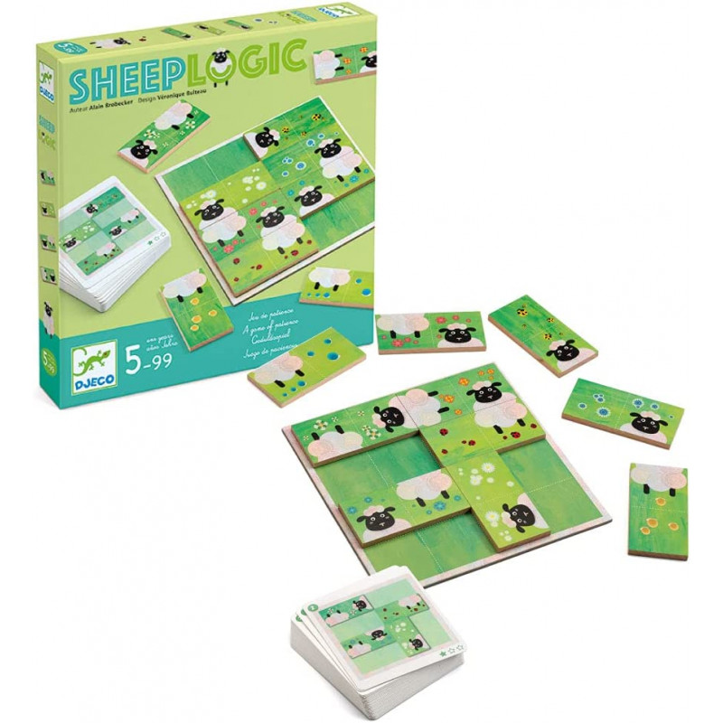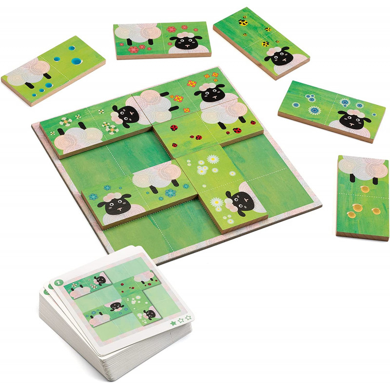 Le jeu contient 10 dominos en bois sur lesquels sont imprimés des demi-moutons et 30 cartes défis.