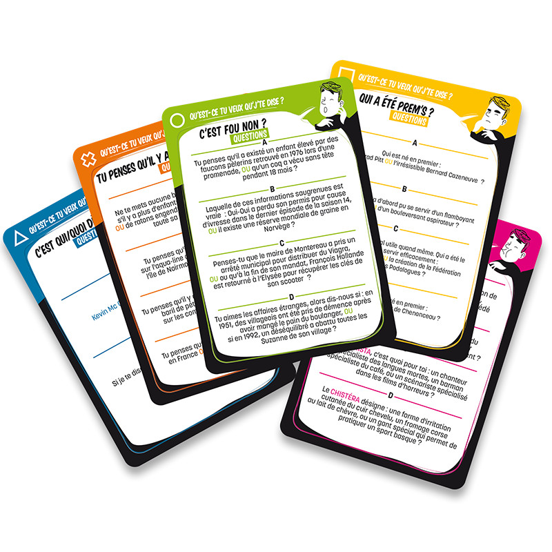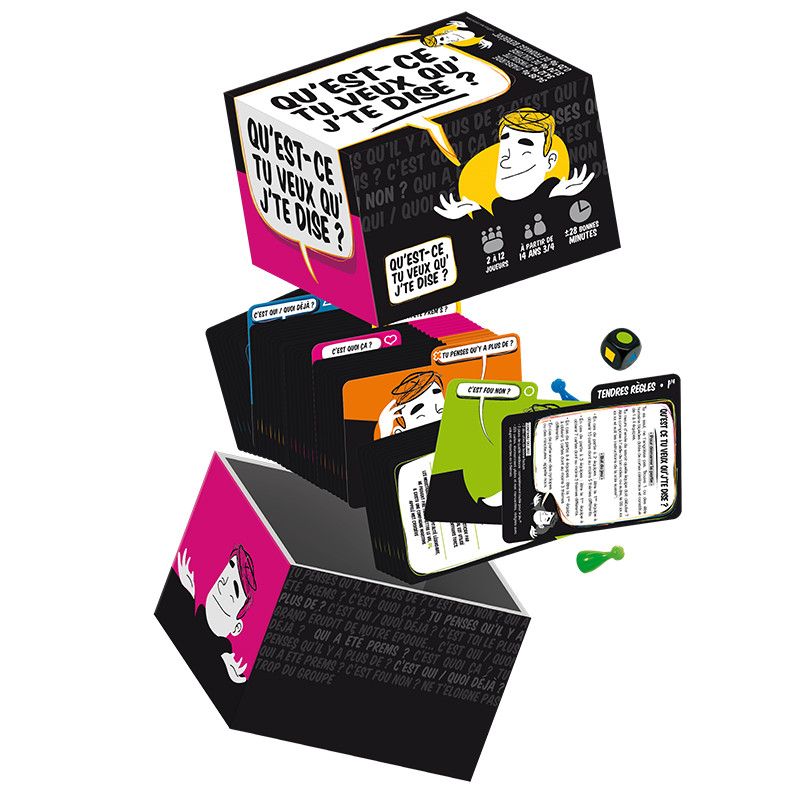 Pas de plateau, pas de figurines, pas de règles complexes : Qu’est-ce tu veux qu’j’te dise ?! est un jeu d’ambiance de questions/réponses avec 1 000 questions réparties en 5 thèmes mélangeant culture, insolite et absurde.