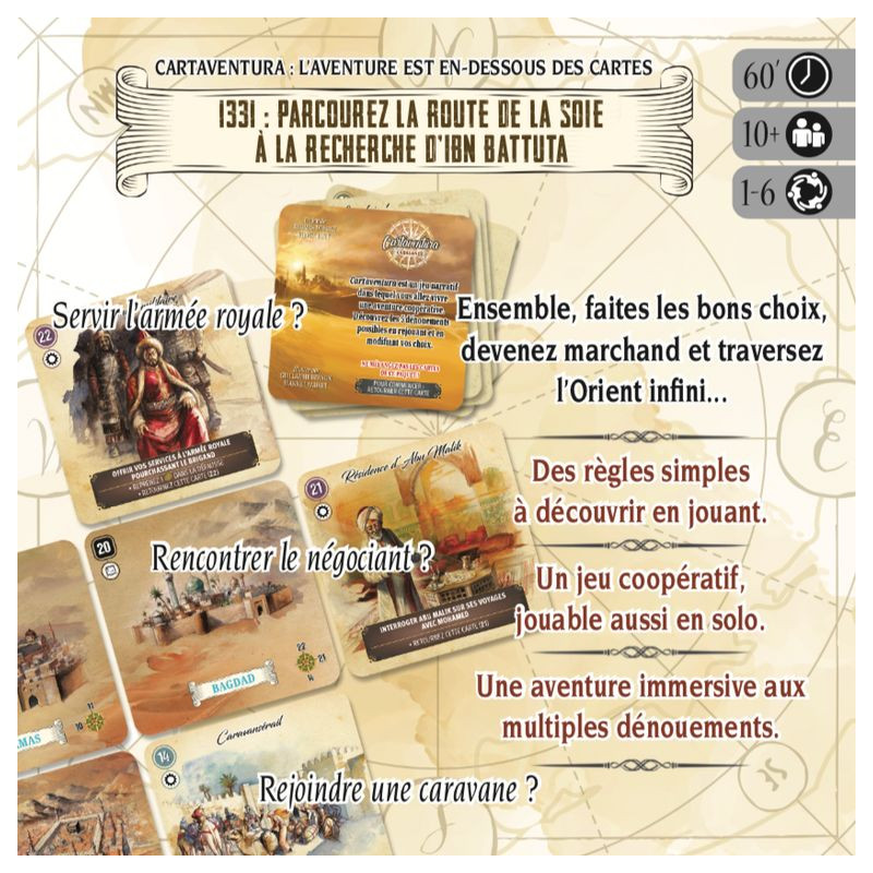 Cartaventura est une collection d'aventures narratives historiques au format poche. Construisez votre aventure à l’aide de cartes qui proposent différentes options. Voyagez, explorez, faites les bonnes rencontres afin d’offrir la meilleure fin possible au héros que vous incarnez !
