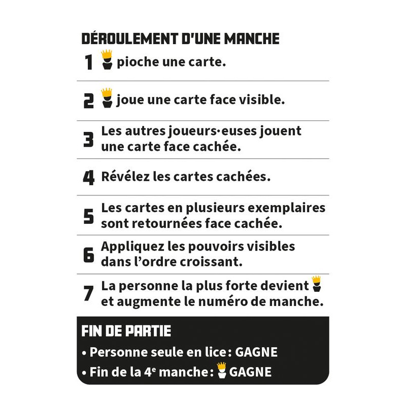 Jouez pour devenir Leader… ou le rester. À chaque manche, les joueurs et joueuses encore en jeu révèlent simultanément une carte. Attention, les doublons sont écartés.