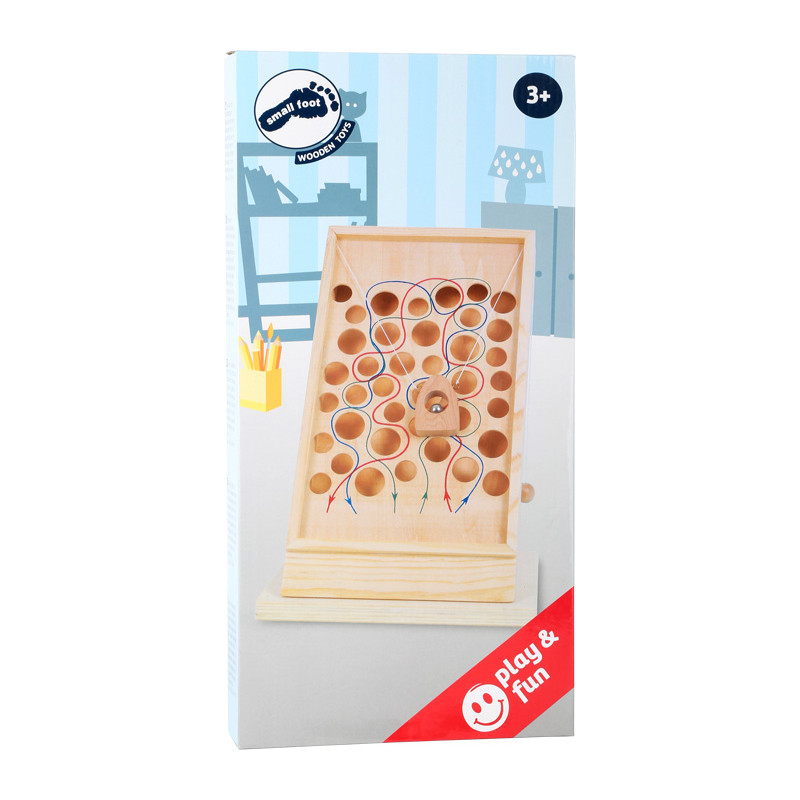Quelle balle atteint la cible ? Concentration et habileté sont requises dans ce jeu d'adresse en bois ! Ici, les enfants doivent avoir les ficelles fermement sous contrôle afin de manœuvrer la navette en bois avec la balle en toute sécurité le long des chemins colorés qui passent devant les trous.