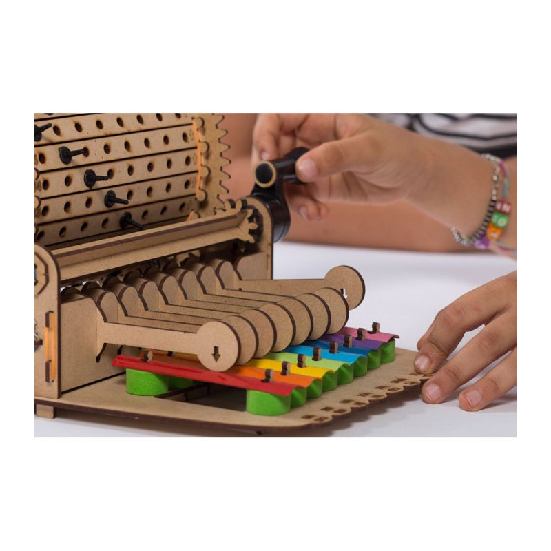 Construisez un xylophone, insérez les chevilles et tournez la poignée pour jouer la musique que vous avez choisie.